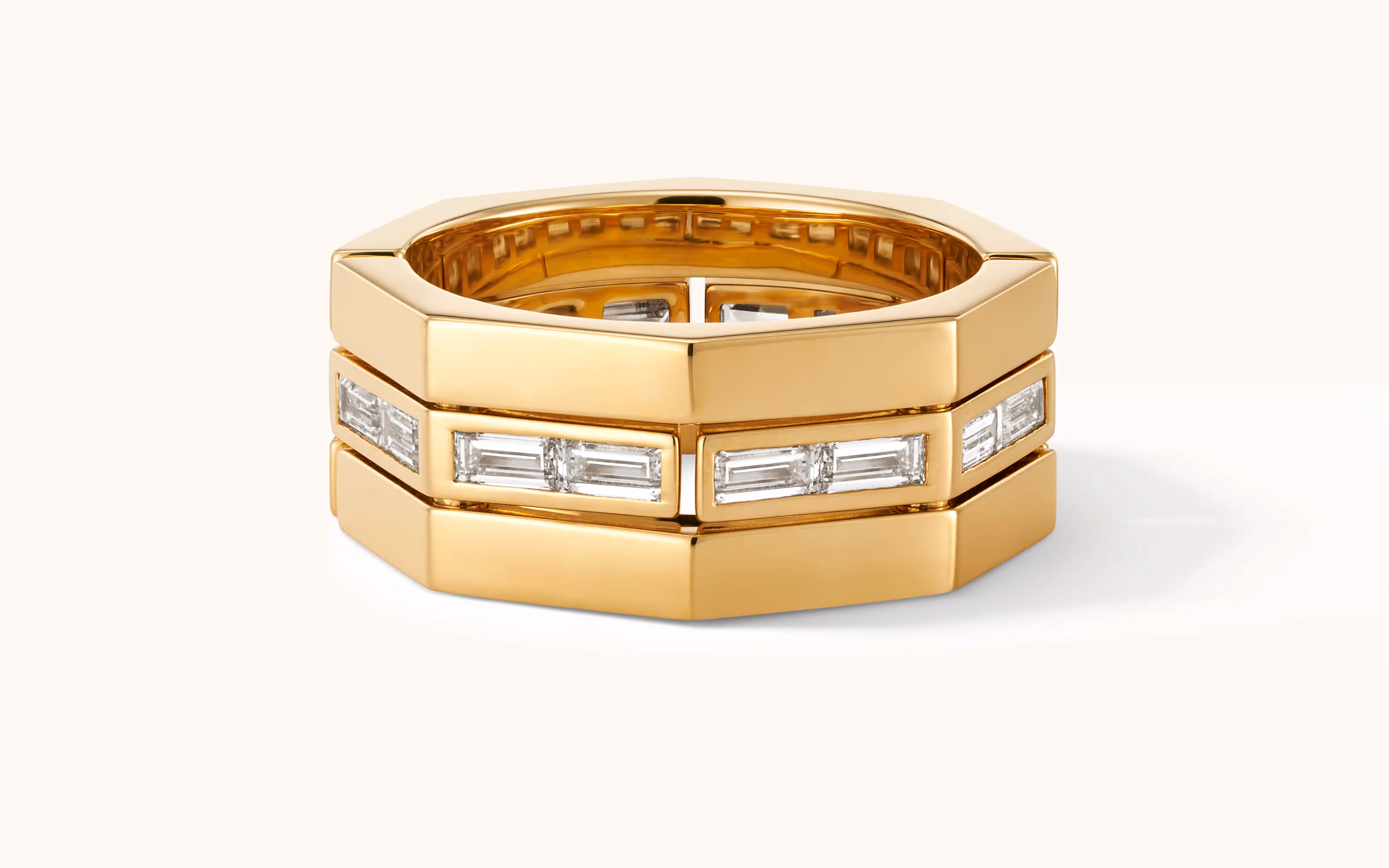 H. Krieger ring, 18k white gold with a three-row ring band set with baguette-cut diamonds totalling 1.20 carats.