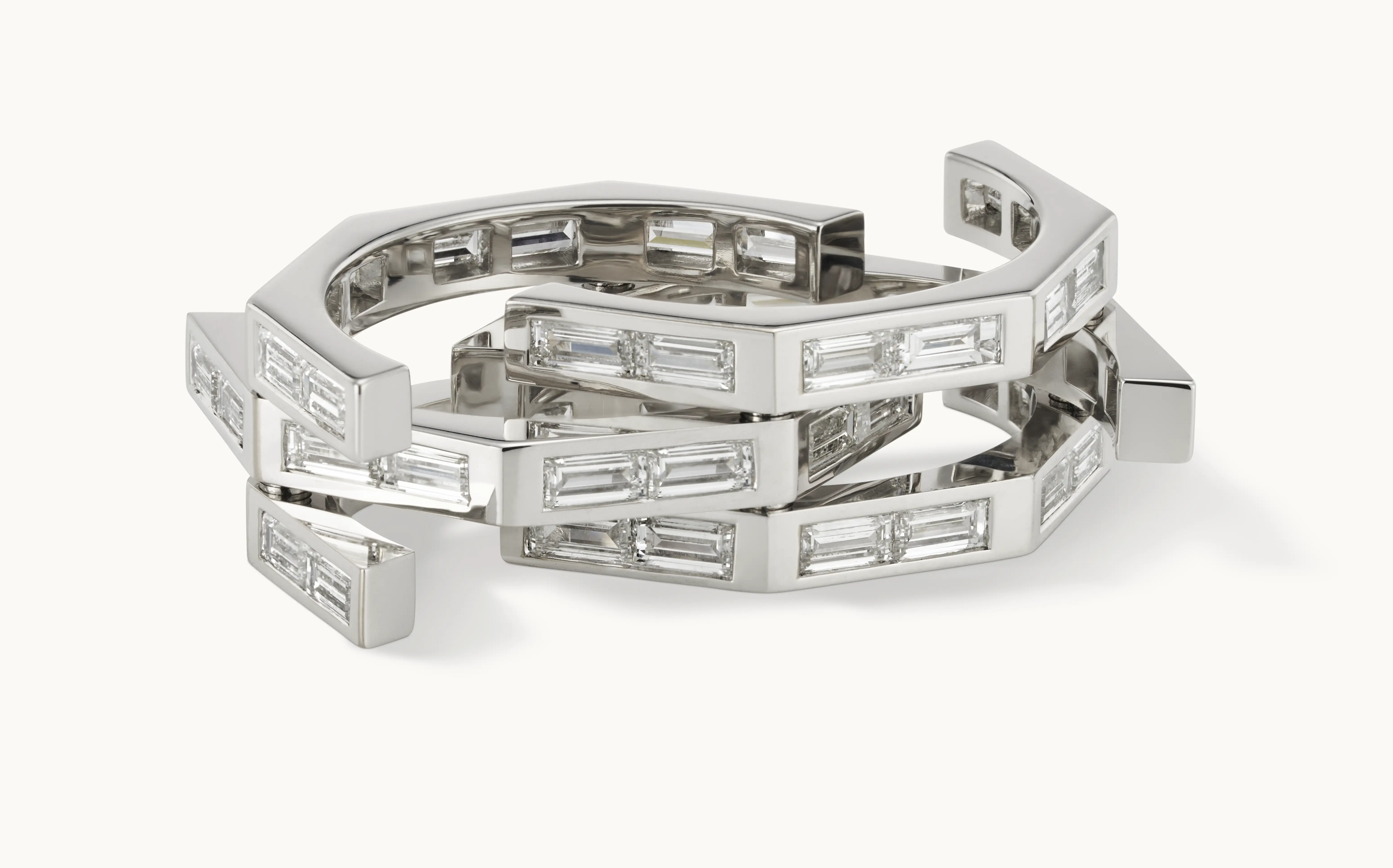 H. Krieger ring, 18k white gold with a three-row ring band set with baguette-cut diamonds totalling 3.46 carats.